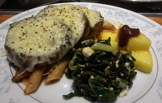 Eggplant parm doesn't have to be greasy: eggplant parmesan (grilled eggplant, provolone, shredded parmesan, whole wheat penne, home canned marinara); chard and feta (Swiss chard, lemon juice, marsala, feta); pineapple and scorpion pepper sauce.